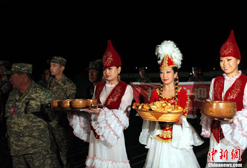 在奥塔尔市火车站站台上举行的简朴而隆重的欢迎仪式上,用中、俄两种文字书写的“热烈欢迎‘和平使命-2010’联合反恐军事演习中方参演部队”的横幅格外醒目,哈方军乐队高奏中、哈两国国歌,3位哈萨克斯坦盛装少女手捧当地特色的美酒、美食,献给风尘仆仆的中方参演官兵。随后,站台另一侧,中方参演部队列车第一车队携行装备,也在紧张有序地进行卸载。