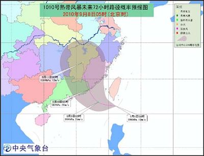 预计,风暴中心将先以每小时10~15公里的速度向偏西方向移动,将于8日傍晚前后进入南海东北部海面,以后逐渐转向西北方向移动,并向广东东部到福建南部一带沿海靠近,强度逐渐加强,并于9日夜间到10日上午在这一带沿海登陆。