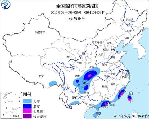 中央气象台2010年9月9日06时继续发布暴雨蓝色预警: