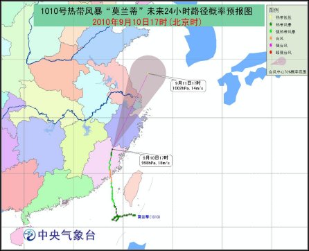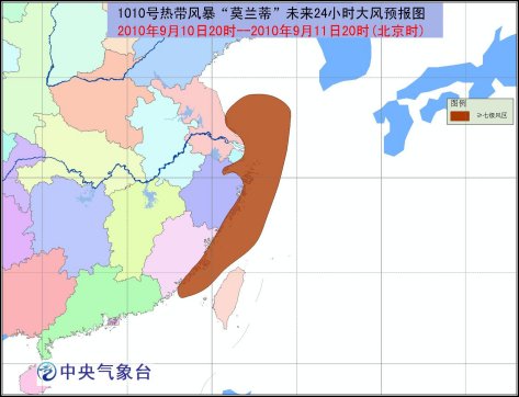 受“莫兰蒂”、西南季风和冷空气的共同影响,9月10日20时到11日20时,台湾海峡、东海西部海面、台湾沿海、福建沿海、浙江沿海、杭州湾、长江口区有7-8级大风,阵风可达9-10级;江苏东部和南部、上海、安徽东南部、浙江大部、江西东北部和东南部、福建西北部和南部、广东大部、广西南部、海南中北部等地有大雨或暴雨,局地有大暴雨。