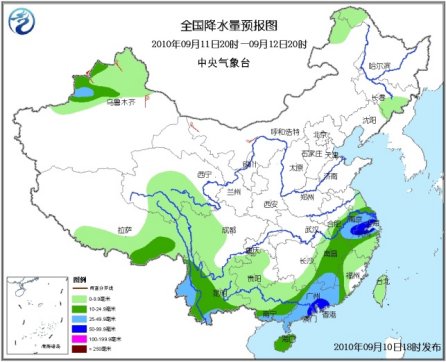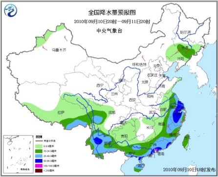 10日20时至11日20时,新疆西北部、青海南部、西藏中东部、内蒙古东南部、东北中南部、山东东部、江淮中东部、江南大部、华南、四川西部、重庆东南部、贵州、云南等地有小到中雨或阵雨,其中,江苏东部和南部、上海、安徽东南部、浙江大部、江西东北部和东南部、福建西北部和南部、广东大部、广西南部、海南中北部、云南大部、川西高原南部、西藏东南部等地有大雨或暴雨,局地有大暴雨;上述地区局部并伴有短时雷雨大风或冰雹等强对流天气。新疆北部、内蒙古东部、东北南部、华北东北部等地有4~5级风。黄海南部海域有5~6级西南风增大到7~8级的旋转风,阵风可达9~10级;东海西部海域、台湾海峡有7~8级偏南风,阵风可达9~10级;南海东北部海域、台湾以东洋面和以南海域有5~7级西南风;黄海中部海域将有5~6级东北风。