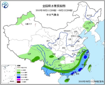 11日08时至12日08时,新疆西北部、青海南部、西藏中东部、吉林南部、辽宁中北部、江淮大部、江南中东部和南部、华南以及西南地区大部有小到中雨或阵雨,其中,江苏东南部、上海、浙江大部、江西东北部和东南部、福建大部、广东中南部和东部、广西南部、云南南部等地有大雨或暴雨;上述地区局部并伴有短时雷雨大风或冰雹等强对流天气。新疆北部、甘肃西部等地有4~6级风。黄海南部海域、东海西部和北部海域将有7~8级、阵风9~10级大风。