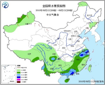 中新网9月11日电 据中央气象台预报,未来三天,南方大部地区有小到中雨或阵雨天气,其中,江淮南部、江南东部、华南南部、云南南部和西部、川西高原南部、四川盆地西部等地有大雨或暴雨;部分地区并伴有短时雷雨大风等强对流天气。新疆北部、内蒙古大部有4~6级风,新疆山口地区风力可达7~8级。