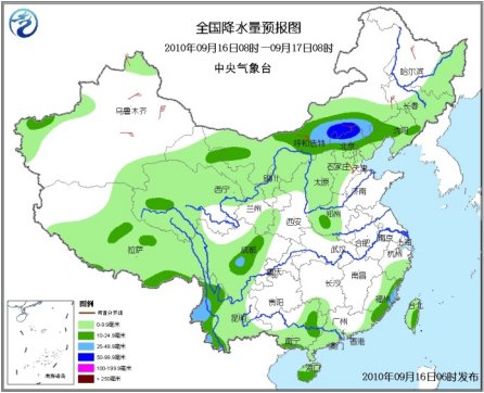 中新网9月16日电 据中央气象台预报,未来三天,新疆西部、青海、西藏中东部和南部、西北地区中东部、内蒙古大部、东北大部、华北、云南、四川等地有小到中雨或阵雨天气,其中,内蒙古中部偏南地区、华北中北部、云南西部、辽宁及台湾东部等地的部分地区有大雨,局地有暴雨,上述地区局部并伴有短时雷雨大风或冰雹等强对流天气。