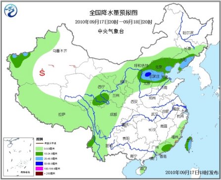 17日20时至18日20时,新疆西部、青海东部、西藏大部、甘肃中东部、宁夏、陕西北部、内蒙古中南部、辽宁、吉林南部、华北大部、山东西北部、四川中西部、云南西部、浙江南部、福建东部和南部、台湾、广东中东部、海南东部等地有小到中雨或阵雨,其中,山西北部、河北中部和东部、辽宁南部、台湾东部、新疆南疆西部山区等地的部分地区有大雨,局部暴雨;上述地区局部并伴有短时雷雨大风或冰雹等强对流天气。新疆南疆中东部、甘肃西部等地有4~6级风,并伴有扬沙或沙尘暴。台湾以东洋面将有7~9级大风,部分海域的风力将有10~12级,台风中心经过的附近洋面将有13~16级大风;东海南部海域将有6~8级偏东风;台湾海峡的东北风将由5~6级增加到7~8级;台湾以南海域将有6~7级偏西或西北风。另外,渤海将有5~7级东北风。