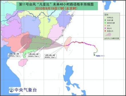 今年第11号强台风“凡亚比”于19日14时在中国台湾省台南县楠西乡境内减弱为台风,17时台风中心位于台南县七股乡境内,就是北纬23.1度、东经120.1度,中心附近最大风力有12级(35米/秒),中心最低气压为965百帕。