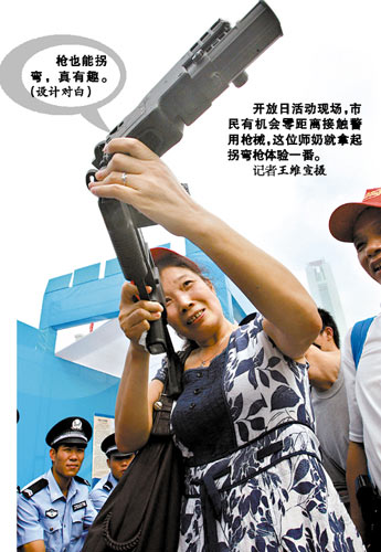 活动吸引了许多男女老少慕名前来观看,男孩子对各种各样的新式武器特别感兴趣,都想亲自摸一摸试一试,女孩子则对扮相很酷的男特警、女特警很痴迷,纷纷掏出相机和手机拍照。