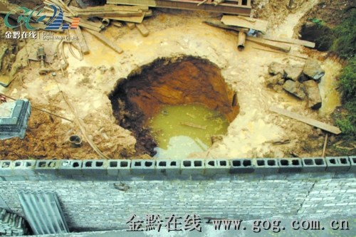 接到报料后,记者立即驱车赶往织金县城地陷现场。记者看到,现场已被警方拉上警戒线,位于警戒区内3户居民的楼房已悬空,下方出现很大一个深潭,潭内水质浑浊,无法预测深度。此处地陷形成的圆形深洞,直径达10多米,深洞边缘随时有可能出现坍塌现象。现场的民警称,险情发生后,织金城关派出所已连夜出动20多名警力,部署在险情区域维护安全,防止无关人员进入。除最严重的民宅下陷外,周边上千平方米区域内,还有多处出现不同程度地陷,其中另一处严重地陷点位于附近一施工现场工地内,该深洞直径约6米、深约5米。