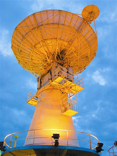 甲板上,2个巨大的乳白色雷达锅,警觉地注视着卫星即将飞来的方位。船舱内,一排排彩色显示屏幕上,不断变化着各种信息画面和数据。船员们各自坚守着岗位。