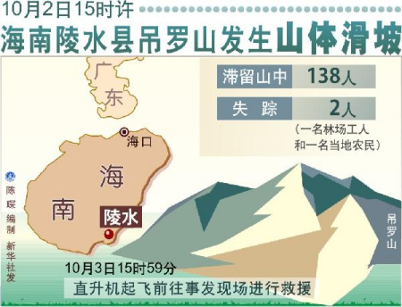 吊罗山区于2日15时发生山体滑坡事件,125名游客和13名吊罗山林业局工作人员被滞留山中。海南省和陵水县有关部门原定于4日上午根据天气变化情况择机开展救援行动。
