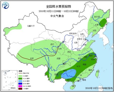 中新网10月11日电 据中央气象台预报,未来三天,新疆西部、西藏中东部、青海大部、内蒙古东部、东北大部、川西高原北部等地有小到中雨(雪)或雨夹雪,西北地区东南部、黄淮南部、江淮、江汉、江南、华南、西南等地有小到中雨或阵雨,其中,贵州大部、广西中北部、湖南北部、湖北南部、重庆东南部、浙江中北部等地有中到大雨,上述地区局部并伴有短时雷雨大风等强对流天气。