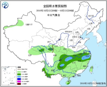 中新网10月12日电 据中央气象台预报,未来三天,新疆西部山区、西藏东部、青海东部和南部、内蒙古东北部、黑龙江西北部、甘肃南部、川西高原西北部等地有小到中雨(雪)或雨夹雪,西藏东北部、青海东南部局地有大雪;陕西南部、黄淮南部、江淮、江汉、江南、华南、西南等地有小到中雨或阵雨,其中,四川南部、重庆中北部、贵州中部、云南北部、湖南北部、湖北南部、江西北部、安徽南部、浙江中部等地有大雨,上述地区局部并伴有短时雷雨大风等强对流天气。