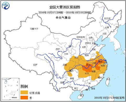 中新网10月17日电 据中央气象台消息,中央气象台10月17日06时继续发布大雾蓝色预警:预计今天(17日)早晨到上午,黄淮南部、陕西南部、江淮、江汉、四川盆地大部、重庆大部、江南大部、福建中西部等地将有轻雾或霾。