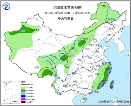 受强冷空气影响,新疆大部将有5~7级风,新疆山口及百里风区风力可达8~10级,温度将下降6~12℃,南疆局部地区降温可达14~18℃,南疆的部分地区有扬沙或沙尘暴天气,22~23日,新疆将有小到中雨,局部地区有大雨或暴雨天气,新疆沿天山地区将有中到大雨转中到大雪,局部地区有暴雪。23~25日,冷空气继续东移,将自西北向东南影响我国大部地区,中东大部地区将有4~6级偏北风,温度将下降6~12℃,局部地区降温可达14~18℃。西北地区东部、内蒙古、华北、东北等地有小到中雨(雪),西北地区东部偏北地区、华北北部、内蒙古东北部、东北等地的局部地区有大到暴雪。