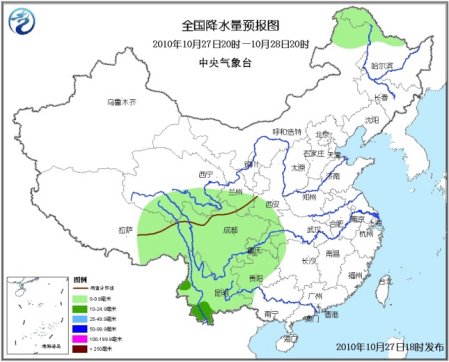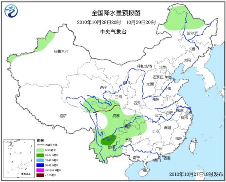 中新网10月27日电 据中央气象台预报,未来三天,新疆西部山区和北部、西藏东部、青海南部、甘肃南部、川西高原北部、内蒙古东北部、黑龙江北部等地有小雨(雪)或雨夹雪。陕西南部、西南地区大部、湖北西南部、湖南西北部等地有小到中雨。
