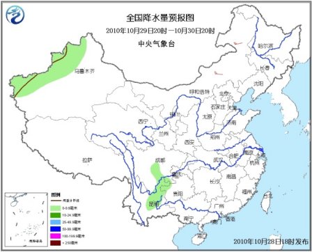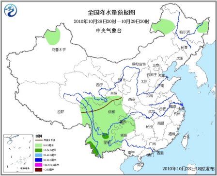 28日20时至29日20时,新疆西北部山区、青海东南部、甘肃东南部、西藏东部、川西高原北部、内蒙古东北部、黑龙江东北部等地的部分地区有小雨(雪)或雨夹雪。西南地区大部有小到中雨或阵雨。内蒙古东部、黑龙江、吉林北部、江南东部沿海、华南沿海等地有4~5级风。东海东北部、东海南部、台湾海峡、台湾以东洋面将有9~10级东北风,阵风可达11~12级;东海西北部、台湾以南海域、南海东北部和中部将有7~8级、阵风9~10级的东北风;南海西北部和西南部将有6~7级东北风;黄海南部、北部湾将有5~6级东北风。