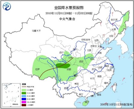 10月31日08时至11月1日08时,新疆南疆盆地西北部、内蒙古东北部、黑龙江西北部、西藏南部、青海东南部、甘肃南部、川西高原北部等地有小雨(雪)或雨夹雪;陕西西南部、四川北部等地的部分地区有小雨或阵雨。内蒙古东部、东北地区等地有4~6级风。台湾海峡、台湾以东洋面和以南海域、南海东北部、中部和西南部海域将有7~8级、阵风9级的东北风;东海东北部和南部海域、南海西北部海域将有6~7级、阵风8级的东北风。