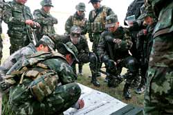 “丛林就是我们另一个营区。丛林生存的首要原则,要把大自然当朋友,千万不能恐惧和害怕!”猜颂堪的开场白让中方队员耳目一新。接下来,随着教学片的播放,猜颂堪通过翻译向中方队员介绍野外方位确定、宿营地选择、水源食物寻找、对野生动物防范等生存技能。