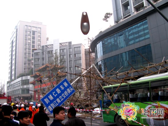 华龙网记者刚刚获悉,今日下午17时左右,重庆南岸区江南大道海德大酒店对面的一处工地数百平米脚手架发生垮塌,倒塌的钢架将南坪南路站站台压变形,并有两辆公交车也被钢管砸中。截至记者发稿,已有4名伤员被送往医院,目前该路段已经双向已实行交通管制,禁止车辆通行。