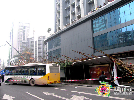记者于17时40分左右赶到现场,事发工地位于江南装饰市场旁边的南坪南路公交车站处,脚手架垮塌面积约约有数百平米,由于旁边就是车站,部分钢管垮塌将站台压变形,两辆公交车被钢管压到,此外,公交站台附近一个装有摄像头的交通路牌被完全压倒。
