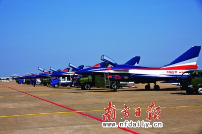 昨日中午12点15分,中国空军八一飞行表演队已经飞抵珠海。伴随着飞机引擎的轰鸣,3架以蓝、白、红为主色的歼10出现在珠海航展中心上空。3架飞机宛如三把直刺长空的利剑,连续两次掠过蓝天,然后相继在珠海机场降落。约12点45分,另外4架歼10也相继到达(见图,陈俊摄)。这意味着换装歼10飞机后的航展期间,八一飞行表演队每天都将进行一场飞行表演,准备了18套动作,每次表演时间约22分钟。