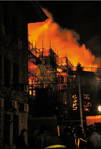 昨天凌晨2点15分记者赶到现场时,警方已在火场百米开外拉起警戒线,数十名围观者站在警戒线外议论纷纷。火场内,数百名消防官兵来回奔波,一辆消防车升起云梯,几名消防员手持水枪不断向失火大楼喷水,地面大量黑水流淌。楼外脚手架被烧得焦黑一片,部分木料被烧毁。此时火势已被基本控制,但仍有大量白烟腾空而起。