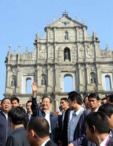 14日,温家宝在澳门特别行政区行政长官崔世安的陪同下,先后参观澳门大炮台、澳门博物馆、大三巴牌坊,考察了澳门生产力暨科技转移中心、澳门工联北区综合服务中心、仁伯爵综合医院、澳门大学等机构,看望澳门广大市民,和大家真情互动,深切了解澳门历史和经济、社会发展情况。他还走访市民家庭,了解澳门普通居民的生活现状。