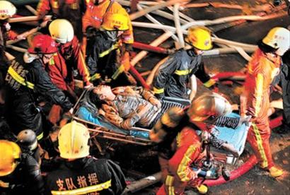 由于火灾扑救时间较长,一些消防救援人员也已经体力不支。记者看到,一名消防人员险些昏倒在现场,旁边的120救援人员和民警立即赶上,扯开他的衣服,并立即对他展开急救。另一名消防人员由于不堪大火高温的炙烤,他的头盔里裹着一条湿毛巾,而他依然背着一名已经昏迷的被困市民踉踉跄跄地跑出火灾现场。旁边的同事见状立即上前扶住被困市民,这名消防人员随即跌坐在了积水的地面上。