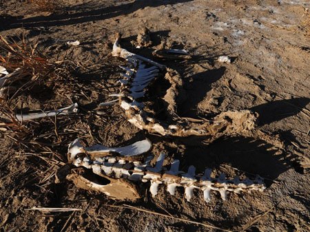 队员们在寻找国家一级保护动物野骆驼的时候,意外地发现,在一具野骆驼的尸体旁,居然有几堆狼粪。这说明,经过多年的开发,淡水不断地引进,少量的动植物开始生长在罗布泊这块钾盐极高的土地上。