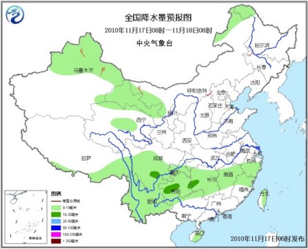 17日08时至18日08时,新疆北部、甘肃河西地区、青海北部和中部、内蒙古西部和东北部、黑龙江西北部、西藏东部和南部、川西高原等地有小到中雪(雨)或雨夹雪,其中,新疆西北部的局地有大雪;四川盆地南部、重庆南部、贵州、云南、江南大部、海南东部以及台湾等地有小到中雨或阵雨。新疆北部、甘肃西部、青海北部、内蒙古大部、东北地区西部、华北北部等地有4~6级风。渤海、黄海北部将有4~6级西南风;东海南部将有5~6级东北风;台湾海峡、台湾以东洋面和以南海域、南海东北部将有6~7级、阵风8~9级的东北风;南海西北部和中部将有5~7级、阵风8级的东北风。