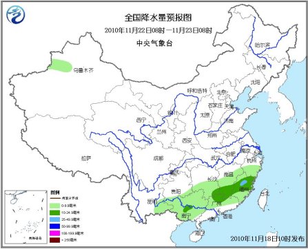22日08时至23日08时,新疆天山地区有阵雪,江南南部、华南大部有小到中雨,局部地区有大雨。