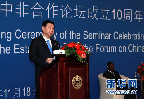 中国国家副主席习近平18日在纪念中非合作论坛成立10周年研讨会开幕式上发表演讲时提出4点倡议,以进一步推进中非合作,共创中非新型战略伙伴关系的美好未来。