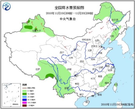 19日08时至20日08时,新疆北部、西藏中东部、青海南部、川西高原北部、内蒙古东北部、黑龙江大部、吉林中部等地有小到中雪(雨)或雨夹雪,其中,新疆塔城地区西部、伊犁河谷、北疆沿天山一带、天山山区、阿勒泰等地有大雪,局地暴雪;西藏东南部、四川西部、云南、福建大部、浙江南部、台湾北部以及辽宁东部等地有小到中雨或阵雨。新疆北部、西北地区中东部、内蒙古大部、东北地区等地有4~6级风,新疆山口地区风力可达8~9级。台湾海峡、台湾以东洋面和以南海域、南海东北部和中部海域将有5~7级东北风;东海南部海域、南海西北部海域、北部湾将有4~6级东北风。