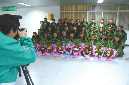 在院方的安排下,下午2时,威远县人民医院收治的29名矿工统一穿上抢险时发的绿色军大衣,走出病房准备照个全家福。“照片洗出来后,我们会分寄给每个矿工,留作纪念!”该医院院长李伟说。