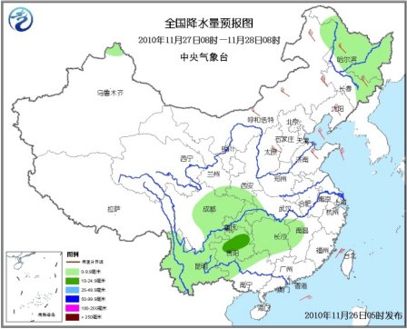 27日08时至28日08时,内蒙古东北部、黑龙江大部、吉林东部等地有小到中雪(雨)或雨夹雪,其中黑龙江中东部的部分地区有大雪;西南地区大部、陕西南部、湖北西南部、湖南、江西西部、广西北部等地有小雨或阵雨,贵州北部有中雨。内蒙古中东部、华北东部、东北、黄淮东部等地有4~6级风。黄海中北部有6~7级、阵风8~9级的西北风;台湾海峡、台湾以东洋面和以南海域、南海大部有5~7级东北风。