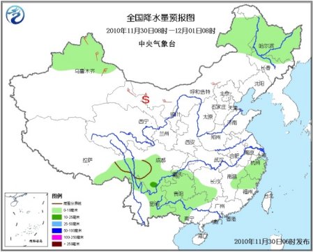 30日08时至12月1日08时,新疆北部、西藏东部、川西高原中部、内蒙古东北部、黑龙江大部、吉林北部等地有小到中雪(雨)或雨夹雪,其中,新疆北部的部分地区有大雪,局地暴雪;四川南部、云南北部和中东部、贵州、重庆南部、湖南西部、广西北部和西部、江西东北部、浙江大部、福建北部等地有小到中雨或阵雨。新疆北部、甘肃西部、内蒙古中西部等地有4~6级风,新疆山口地区风力可达8~9级;内蒙古西部的部分地区有扬沙或浮尘天气。东海南部海域将有5~7级东到东北风;台湾海峡、台湾以南海域、南海北部和中部海域将有5~7级东北风。