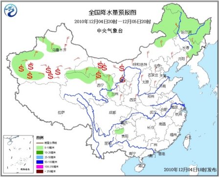 4日20时至5日20时,南疆西部和天山西部地区、甘肃祁连山地区、青海北部、内蒙古东北部、黑龙江大部、吉林东部等地有小到中雪(雨)或雨夹雪;贵州西北部有小雨或阵雨;新疆大部、西北地区东部、内蒙古、东北、华北、黄淮北部等地有5~7级风,新疆山口地区风力可达8~9级,南疆盆地、内蒙古西部、甘肃西部等地的部分地区有扬沙或浮尘天气,局地有沙尘暴渤海、黄海北部海域将有将7~8级、阵风9~11级的偏北风;黄海中部海域将有5~6级西南风转7~8级东北风;台湾海峡、台湾以南海域和以东洋面、南海大部海域将有5~7级东北风。