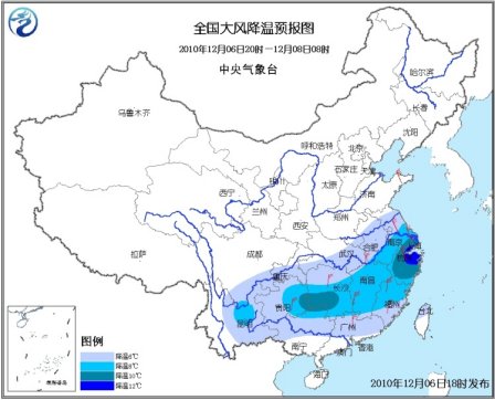 中央气象台预计,12月6日20时至8日08时,江淮、江汉南部、江南、华南中北部及贵州、云南中东部、四川东南部、重庆南部等地将继续出现6~10℃降温,其中,江南东部等地的部分地区降温幅度可达12℃以上;山东半岛、江淮、江南、华南东部等地有4~6级偏北风。