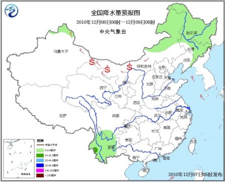 8日08时至9日08时,新疆北部、内蒙古东北部、黑龙江、吉林大部、辽宁东北部等地有小到中雪或雨夹雪,其中,黑龙江东南部、吉林东北部局地有大雪,局地暴雪;云南等地有小到中雨或阵雨。新疆东北部、甘肃、内蒙古中西部等地有4~6级偏北风或偏西风。甘肃西部、内蒙古中西部的部分地区有扬沙或浮尘。渤海、黄海大部海域将有6~7级、阵风8级的西北风;东海大部海域将有5~7级西北风;台湾海峡、台湾以东洋面和以南海域、南海西北部海域将有5~6级东北风;南海东北部、中部和西南部海域将有6~7级、阵风8级的东北风。