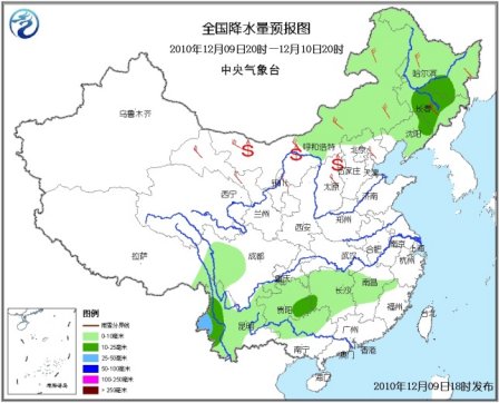 9日20时至10日20时,内蒙古中东部及河套东部、东北地区大部、河北北部、西藏东部、川西高原中南部等地有小到中雪或阵雪,其中,内蒙古东南部、黑龙江南部、吉林中西部、辽宁北部、川西高原西部等地的部分地区有大雪,局地有暴雪;四川盆地南部、重庆南部、云南大部、贵州、湖南大部、江西中北部、广西北部、福建西北部等地有小到中雨,其中,云南西部的局地有大雨;西北地区中东部、内蒙古大部、东北、华北等地有4~6级风;甘肃西部、内蒙古中西部、宁夏、陕西北部等地的部分地区有扬沙,局部地区有沙尘暴;渤海、黄海北部和中部海域将有7~8级、阵风9级的西南风转西北风;黄海南部海域将有6~7级、阵风8级的西南风转西北风,东海北部海域将有5~6级西南风,台湾以南海域、南海东北部、中部和西南部海域将有5~7级东北风。