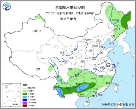 10日20时至11日20时,内蒙古东北部、黑龙江、吉林大部、辽宁东北部等地有小到中雪或阵雪,其中,黑龙江中东部、吉林东部有大到暴雪;西南地区南部和东部、湖北西南部、湖南、江西中南部、福建大部、浙江南部、广西、广东中西部等地有小到中雨,其中,云南西南部、广西北部等地的部分地区有大雨。新疆北部、内蒙古中东部、东北、华北中东部、山东半岛等地有4~6级风。黄海中北部有7~8级、阵风9~10级的西北风转4~6级偏西风;渤海有6~7级西北风转4~5级西南风;黄海南部有6~7级西北风转5~6级东北风;台湾海峡有5~7级东北风。