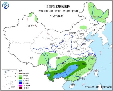 11日08时至12日08时,新疆北部、黑龙江、西藏东部、川西高原北部等地有小到中雪(雨)或雨夹雪,其中,黑龙江东北部有大雪;江汉南部、江南大部、华南大部、西南地区南部和东部有小到中雨或阵雨,其中,云南南部、贵州南部、湖南南部、广西北部等地的部分地区有大雨。新疆北部、青海北部、内蒙古西部和东部、东北大部等地有4~6级风;内蒙古西部有扬沙或浮尘。黄海南部、东海大部有5~6级北到东北风;台湾海峡有5~7级东北风。