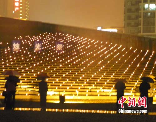 中新网南京12月12日电 (朱晓颖 申冉 孙翔鸣)“我们共风雨,我们共追求,我们珍存同一样的爱,无论你我可曾相识,无论在眼前在天边,真心的为你祝愿……”12日晚间,在侵华日军南京大屠杀遇难同胞纪念馆集会广场上,南京和平鸽艺术团的孩子们的歌声回响其间,3000支红烛点亮,悼念30万遇难同胞。