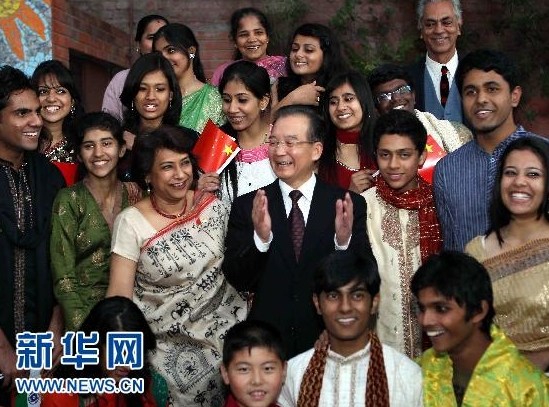 在中印商务合作峰会发表演讲后,16时30分许,温家宝总理来到了泰戈尔国际学校。校园里,许多学生身着民族服装,挥舞着中印两国国旗,用汉语欢迎温总理的到来。