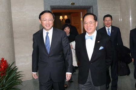 中新网12月21日电 据外交部网站消息,2010年12月21日,杨洁篪部长会见来京述职的香港特区行政长官曾荫权。