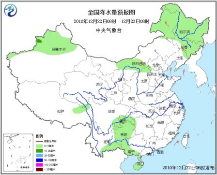 22日08时至23日08时,新疆北部、西藏东北部、内蒙古东北部和西部的偏东地区、黑龙江、吉林大部等地有小到中雪或阵雪,其中,新疆西部及沿天山的部分地区有大雪,局地暴雪;四川盆地南部、贵州、云南东南部、广西西部和南部、海南大部等地有小雨或阵雨。内蒙古大部、西北地区东北部、东北地区中南部、华北、黄淮东部等地有4~6级风。渤海将有4~5级增大到7~8级、阵风9级的东北风;黄海北部海域将有4~6级西南风转7~8级、阵风9级的偏北风;黄海中部海域将有4~6级西南风转6~7级、阵风8级的偏北风。