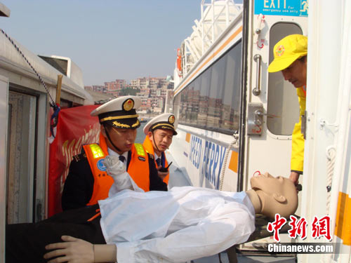 “‘海峡一号’呼叫,我轮在北纬**度***分、东经**度***分处因避让紧急停车造成船上1名旅客受重伤,2名人员落入海中,船舶搁浅造成机舱舱壁破损,燃油外泄,请求救援!”上午10时,随着模拟泉金直航客轮“海峡一号”船长的紧急呼救,演练正式开始。