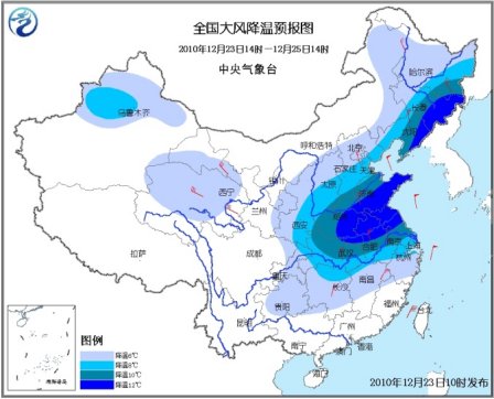 预计,12月23日14时至25日14时,新疆北部、西北地区中东部、内蒙古东部、东北、华北、黄淮、江淮、江汉、江南大部、四川东北部、重庆大部、贵州等地将出现6~8℃降温,其中,华北南部、黄淮、江淮、江汉、吉林中东部、辽宁中东部等地的部分地区降温幅度可达10~14℃;上述大部地区有4~6级偏北风。