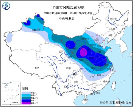 中新网12月28日电 中央气象台28日清晨发布寒潮蓝色预警,预计,12月28日8时至30日8时,新疆西部和北部、甘肃大部、宁夏、陕西、内蒙古中西部、华北、黄淮、江淮、江汉、重庆北部、江南中北部等地将出现6~10℃降温,其中,新疆北部、内蒙古西部、宁夏北部、陕西中北部、山西中南部、山东南部、河南北部和东部、安徽中北部、江苏中西部等地的部分地区降温幅度可达12~14℃;上述大部地区有4~6级偏北风。