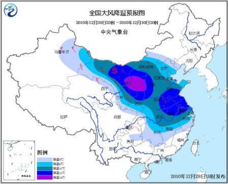 预计,12月28日20时至30日20时,新疆东部、西北地区中东部、内蒙古中西部、华北、黄淮、江淮、江汉、江南、重庆北部、贵州东部等地将出现6~10℃降温,其中,内蒙古西部、西北地区东部、华北西部、黄淮、江淮大部等地的部分地区降温幅度可达12~14℃;黄河以北大部地区有6~7级偏北风,黄淮、江淮、江南北部有4~6级偏北风。